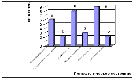 Как видно из таблицы 1, среди испытуемых данной выборки неравномерное количество экстравертов и интровертов. В данной выборке экстравертов на 2 человека больше. 2.3 Изучение состояния участников боевых действийПосле регистрации ответов в протоколах опроса все ответы каждого испытуемого были обработаны в соответствии с ключом к методике. Полученные результаты были занесены в таблицу (таблица 2 приложения 2). После этого были выявлены ведущие психологические состояния у испытуемых (табл. 2). Таблица 2 Распределение испытуемых по преобладанию психологических состояний