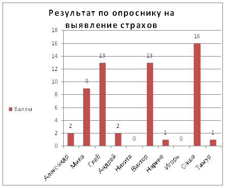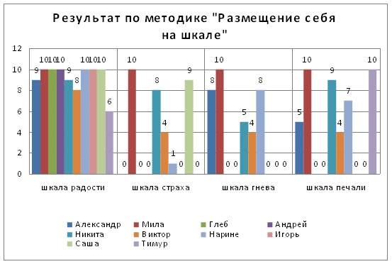 Результаты исследования. Описание результатов к сводной таблице по опроснику на выявление страхов (таблица № 1). В школьном возрасте распространен страх несчастья, беды, рокового стечения обстоятельств, т.е. всего того, что потом получает развитие в страхах перед судьбой, роком и т.д. Подобные страхи, опасения, предчувствия являются отражением зарождающейся тревожности, мнительности, внушаемости. Наибольшая чувствительность к страхам проявляется в 7 лет, меньшая чувствительность - в 15 лет (А.И. Захаров). В младшем школьном возрасте страхи наиболее успешно подвергаются психологическому воздействию, так как они более обусловлены эмоциями, чем характером и еще во многом носят возрастной и переходный характер. На основе ответов по опроснику делается вывод о наличии страхов. У Глеба и Виктора среди имеющихся страхов, большой показатель «медицинских» страхов. Из беседы было выявлено, что дети часто болеют, сталкиваются с необходимостью сдачи крови и других медицинских процедур. У Глеба, Виктора и Саши высокий показатель по страхам, связанный с причинением физического ущерба (неожиданные звуки, транспорт, огонь, пожар, стихия, война). У Милы и Саши выявлены страхи кошмарных снов и темноты. Они до сих пор боятся сказочных персонажей. Это связано со своеобразным развитием эмоциональной сферы умственно отсталого ребёнка, которая проявляется, прежде всего, в незрелости. Социально-опосредованные страхи у Саши: присутствует страх одиночества, страх перед другими детьми; у Виктора: страх перед детьми и страх перед наказанием. У Никиты и Игоря по опроснику общий показатель 0 баллов. Необходимо выяснить причину отсутствия страхов, так как известно, что каждому возрасту соответствует тот или иной страх, а его полное отсутствие может привести к тому, что в определенных ситуациях ребенок может недооценивать реальную опасность, что влечет за собой травматические ситуации. Большое число разнообразных страхов у ребенка – важный показатель предневротического состояния. Такого ребенка следует в первую очередь отнести к группе риска и проводить с ним специальную коррекционную работу. В группу «риска» по опроснику на выявление страхов попадает Саша, с общим показателем 16 баллов - повышенная тревожность. У ребенка высокие показатели «медицинских» страхов; страх перед пожаром, войной; страх смерти своей; страх сказочных персонажей, кошмарных снов, темноты, страх детей и одиночества, высоты и воды. Ребенок группы риска, в отличие от сверстников, более чувствителен, следовательно, и более уязвим по отношению к несбалансированным воздействиям внешней среды. И наиболее ранима в этом плане эмоциональная сфера. Описание результатов к сводной таблице по методике «Размещение себя на шкале» (таблица № 2). Из таблицы видно: по шкале радости наименьшее количество баллов у Тимура; по шкале страха наибольшее количество баллов у Милы (10баллов), Саши (9 баллов) и Никиты (8 баллов). по шкале гнева наибольшее количество баллов у Милы (10 баллов), Александр (8 баллов), Нарине (8 баллов); по шкале печали наибольшее количество баллов у Милы (10 баллов), Тимур (10 баллов), Никита (9 баллов). У Саши высокий показатель по шкале страха. Здесь выявляется тревожность ребенка. Необходимо выяснить причину страха и провести работу по снижению страха. У Милы, Александра и Нарине высокий п