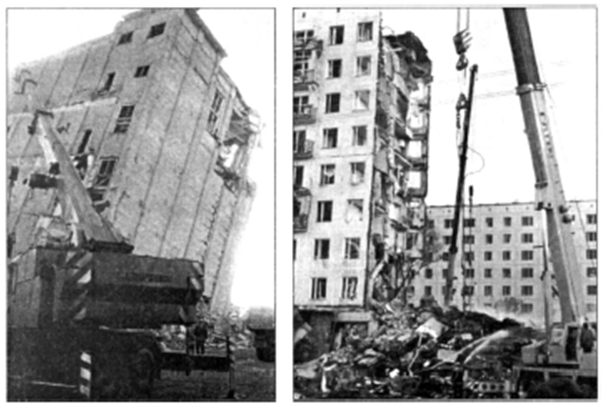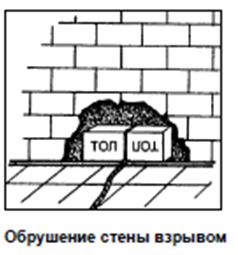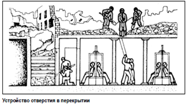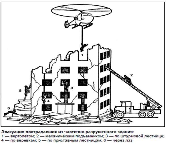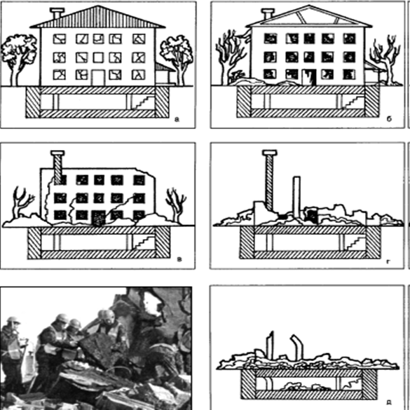 Степень разрушения зданий: а — легкое повреждение; б — слабое; в — среднее; г — сильное; д — полное разрушение. Пострадавшие могут находиться в верхней, средней, нижней части завала, в заваленных подвалах и подземных защитных сооружениях, технологическом подполье и в помещениях первых этажей. В отдельных случаях они могут оставаться на разных этажах частично разрушенных помещений, в нишах и пустотах, на крышах.