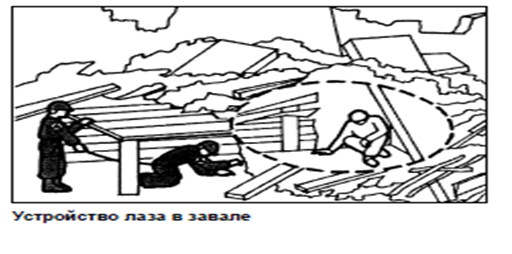 Зачастую пострадавшие находятся в глубине завала. Для извлечения их спасатели проделывают специальный узкий проход (лаз), с учетом кратчайшего расстояния до людей, в наиболее легко преодолеваемых участках завала. Не рекомендуется устраивать лаз в непосредственной близости от больших глыб, поскольку они могут осесть и затруднить работу. Лаз проделывают в горизонтальном, наклонном и вертикальном направлениях. Оптимальная ширина лаза — 0,8-0,9 м, высота — 0,9-1,0 м. Работы по устройству лаза выполняют несколько групп (по 3-4 человека) вручную или с использованием инструмента. В их задачу входит разборка завала, проделывание лаза, подготовка и установка крепежных элементов, удаление извлекаемых обломков, деблокирование пострадавших, их транспортировка. Перемещение спасателей при устройстве лаза осуществляется на четвереньках, ползком лежа на спине, на животе, на боку. Если передвижению спасателей препятствуют крупные железобетонные, металлические, деревянные, кирпичные изделия, то их необходимо обойти, если такой возможности нет, то разрушить, в ряде случаев в них можно проделать отверстие. Особое внимание при устройстве лаза должно уделяться надежному его креплению с целью предотвращения обрушения стенок. Для этого используется специальный, заранее заготовленный крепежный материал, — стойки, распорки, доски, брус, щиты, перекладины, подкосы. При устройстве лаза не допускается передвижение спасателей и техники по верхней части завала. После окончания работ по устройству лаза и креплению прохода спасатели приступают к освобождению людей. В первую очередь определяется состояние пострадавшего и степень его травмирования. Затем освобождаются придавленные или зажатые части тела с одновременным наложением жгутов и сдавливающих повязок, очищаются полости рта и носа, руками удаляются от пострадавшего мелкие обломки, мусор, щебень. В зависимости от физического состояния пострадавшего выбирается способ его извлечения и транспортировки. Освобождать пострадавшего из завала должны, как минимум, два спасателя. Если такая возможность имеется, то его вытаскивают за руки или верхний плечевой пояс. Если это сделать невозможно, то спасатели подводят руки под его плечевой пояс и поясницу и только потом осторожно освобождают пострадавшего. Иногда целесообразно использовать плотную ткань для укладывания пострадавшего или носилки. Если пострадавший находится под большими и тяжелыми элементами завала, то его освобождают с помощью разжимов, домкратов, грузоподъемной техники. В тех случаях, когда пострадавший придавлен к земле, его можно освободить, сделав подкоп. Травмами, характерными для людей, попавших в завалы, являются переломы, ушибы, сотрясение мозга. Специфической травмой считается длительное сдавливание мышц и внутренних органов — синдром длительного сдавливания. Эта разновидность травм характеризуется прекращением кровотока и обмена веществ в сдавленных участках тела, что приводит к интенсивному образованию и накоплению токсических продуктов распада, разрушению тканей, образованию недоокисленных продуктов обмена. При освобождении сдавленного участка тела и восстановлении кровообращения в организм поступает огромное количество токсинов. Оно напрямую зависит от площади пораженных участков и времени сдавливания. Н