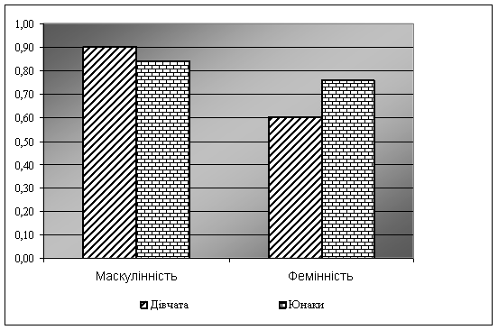 Рисунок 3.1 – Діаграма розподілу середньогрупових показників за шкалами маскулінність і фемінність у юнаків і дівчат Среднегруппової показник маскулінності у юнаків був рівний 0,84, а в групі дівчат – 0,9. Таким чином при аналізі показника маскулінність дівчини і юнаки продемонстрували різницю досить незначну у розмірі 0,06, а різниця в показниках шкали фемінність була значущішою і склала 0,16 (дивитись рисунок 3.1). Уявлення про ідеального викладача у студенток виражаються у великих показниках маскулінності і менших показниках фемінності, ніж у юнаків студентів. При цьому показник основного індексу і у юнаків і у дівчат знаходиться в межах андрогінності з тенденцією слабовираженої маскулінності і дорівнює -0,7 у респондентів жіночої статі і -0,19 у респондентів чоловічої статі. У групі дівчат маскулінність, в межах андрогінності, виражена набагато яскравіше, різниця між показниками двох груп дорівнює 0,51 (дивитись рисунок 3.2). Цікавий факт, що в бесіді абсолютну більшість юнаків (83%) заявляли, що ідеальним викладачам бачать жінку, а інші 27% стверджували, що стать не має значення, і жоден юнак не бачив в ролі ідеального викладача чоловіка. У дівчат подібної тенденції не спостерігалося, так 30% не мали переваг відносно статі викладача, для 43% більш відповідним ідеальному викладача видається чоловіча стать, а 27% віддали б перевагу викладачу жінку.