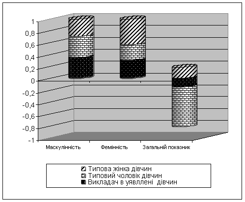 Рисунок 3.2 – Діаграма середньогрупових показників за результатами опитувальника С.Бем в уявленнях дівчин-респонденток Стереотип чоловіка в очах студентів-юнаків по показнику основного індексу представлявся помірно вираженою маскулінністю -0,71. При цьому показник маскулінності дорівнював 0,88, а фемінності – 0,58. Якщо порівнювати ці показники з портретом ідеального викладача, то помітимо, що показники маскулінності практично рівні, а фемінність в образі викладача набагато більш виражена. Розглядаючи стереотип чоловіка в анкетах дівчат, відзначаємо ще більш виражений показник маскулінності – 0,91, а фемінність приблизно на тому ж рівні (0,51), що і в представленнях юнаків. При цьому основний індекс зафіксований на рівні – 0,93, що є найбільш крайнім показником по всіх пунктах в групах як юнаків, так і дівчат. Таким чином, дівчата наділяють образ типового чоловіка яскравіше вираженими маскулінними рисами, ніж самі юнаки. Порівняно з образом ідеального викладача спостерігається незначне збільшення показника фемінності і зниження показника маскулінності, тобто образ викладача містить більше фемінності ніж образ чоловіка, не дивлячись на затвердження респонденток про те, що вони віддали б перевагу викладачу чоловіка. Аналізуючи уявлення респондентів жіночої і чоловічої статі про типову жінку, ми бачимо найбільші розбіжності в думках. Юнаки наділили типову представницю «слабкої статі» достатньо високим показником фемінності (0,91), що означає більш традиційні уявлення про жінку, а маскулінність представлена на достатньо не високому рівні (– 0,56). Основний індекс дорівнює 0,82. Такий розподіл є практично дзеркальним віддзеркаленням уявлень про образ чоловіка серед студентів-юнаків. Таким чином, можна говорити про гармонійніший розподіл показників, який відображає традиційні погляди на стереотип поведінки жінок і чоловіків, який склався в суспільстві, проте без крайніх, шовіністів відхилень. Дівчата наділяють образ типової жінки достатньо вираженими як маскулінними, так і фемінними властивостями. Розподіл показників в цій групі був наступним: маскулінність – 0,75, фемінність 0,86, загальний індекс 0,26. Таким чином, опитані студентки приписують типовій жінці виражені якості як представників чоловічої статі, так і жіночого. Тобто жінка в представленнях студенток андрогінна, проте показник фемінності не понижений. Загалом можна відзначити, що юнаки наділяють жіночу стать більш вираженими фемінними якостями, а дівчата, навпаки, дотримуються більш традиційних поглядів на образ типового чоловіка. Можна, припустити, що опитані студенти схильні бачити консервативніше образ протилежної статі, а образ своєї статі трансформується у бік андрогінності. Уявлення про викладачів у юнаків не співвідноситься ні з образом жінки, ні з образом чоловіка, останні скоріше традиційні. Тоді як образ викладача Вищих учбових закладів наділений вираженими фемінними і муськулінними рисами. Ми схильні припускати, що таке розподіл показників пов'язаний з тим, що викладач через свою професійну діяльність проявляє риси традиційно приписувані як жінкам (наприклад, терплячість, розуміння), так і чоловікам (наприклад, критичність мислення, стриманість). Уявлення про викладачів у дівчат скоріше можна співвіднести з образом чоловіка, оскільки вони наділяють 