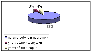 1. Подростки, выбравшие вариант а, б, в, г, д вопроса 5, имеют опыт употребления наркотических веществ (3 девушки, 6 парней.). 2. Для подростков, выбравших вариант г вопроса 4 и вариант а, 6, в, г вопроса 6 характерно позитивное отношение к употреблению наркотиков (1 девушка, 6 парней.). 3. Подростки, выбравшие вариант д вопроса 6 и вариант ж вопроса 7 имеют четко сформированное негативное отношение к употреблению наркотиков.(1 девушка, 9 парней). 4. Подростки, ответившие положительно на вопросы 3 свидетельствуют, что у опрошенных есть друзья, употребляющие наркотики (3 девушки, 9 парней). Таким образом, у большинства студентов 17группы сформировано представление о здоровом образе жизни вообще и о негативном воздействии наркотических веществ на организм человека. Однако отдельные студенты (3 человека) желали бы попробовать некоторые наркотические вещества, а 5 человек в качестве мотивов употребления указали чувство эйфории и попытку показать свою независимость от родителей. Следовательно, профилактическая работа должна быть направлена на развенчание мифов о наркотиках. Таблица результатов по 11 группе