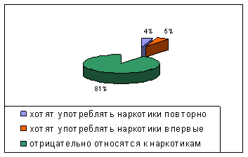 Общие выводы: 1) у большинства студентов имеются общие представления о здоровом образе жизни, но они лишь частично придерживаются его принципов. 2) у части студентов есть знакомые, употребляющие наркотики, поэтому они рискуют поддаться их влиянию. 3) многие студенты не пробовали наркотические вещества и не хотели бы их пробовать в любом случае. 4) некоторая часть студентов считает, что наркотик делает человека свободным и дает ни с чем несравнимое удовольствие, они потенциальные потребители препаратов. 5) большинство уверено в негативном воздействии наркотических веществ на организм человека. 6) регулярное проведение профилактических мероприятий дает стойкий результат, но нельзя останавливаться на достигнутом, нужно использовать различные формы работы и вовлекать всех студентов, особенно относящихся к группам риска (имеющих друзей-наркоманов, заблуждающихся в оценке степени опасности препаратов, желающих испытать новые ощущения и т.п.). Приложение 6 Общая картина отношения студентов МПК к наркотическим препаратам