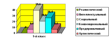 Рис.1. Сравнение типов личности у учащихся 9-го класса Среди учащихся девятого класса преобладает социальный тип личности – 39,6% учащихся. К предприимчивому типу относится 26,4% учащихся, 20,8% учащихся относится к конвенциональному типу, к интеллектуальному и артистическому типам личности относится по 6,6% учащихся.