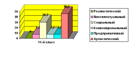 Рис.2. Сравнение типов личности у учащихся 11-го класса Среди учащихся одиннадцатого класса преобладает артистичный тип личности – 46,2% учащихся. К социальному типу относится 30,7% учащихся, а к интеллектуальному, конвенциональному и предприимчивому относится по 7,7% учащихся. По данным дифференциально-диагностического опросника получилось следующее.