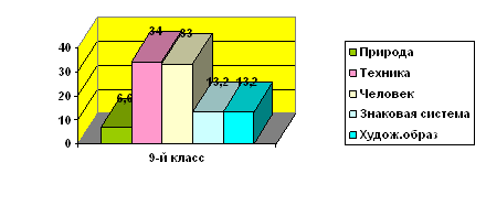 Рис.3. Сравнение соответствия типам профессий у учащихся 9-го класса Среди учащихся девятого класса преобладает соответствие типу профессий «Человек-Техника» – 34% учащихся. По типу «Человек-Человек» было выявлено 33% учащихся, по типам «Человек-Знаковая система» и «Человек-Художественный образ» – по 13,2% учащихся, и по типу профессии «Человек-Природа» 6,6% учащихся.
