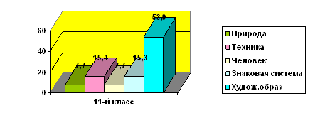 Рис.4. Сравнение соответствия типам профессий у учащихся 11-го класса Среди учащихся одиннадцатого класса преобладает соответствие типу профессий «Человек-Художественный образ» – 53,9% учащихся. По типу «Человек-Техника» было выявлено 15,4% учащихся, 15,3% учащихся относятся к типу «Человек-Знаковая система», и к типам «Человек-Природа» и «Человек-Человек» относится по 7,7% учащихся. Проанализировав результаты анкетирования учащихся девятого класса, можно сделать следующие выводы: 1) 92,4% учащихся хотят получить высшее образование, причем среди выбираемых профессий вновь преобладают экономисты, юристы и психологи, а рабочих профессий по-прежнему нет в списке выбираемых. 2) 79,2% учащихся уже определились с выбором профильного класса. При этом были определены факторы, которые влияют на выбор профиля в современных условиях: самостоятельный выбор сделан 93,4% учащихся и на 6,6% учащихся повлияли друзья. Проанализировав результаты анкетирования учащихся одиннадцатого класса, можно сделать следующие выводы: 1) 100% учащихся хотят получить высшее образование, причем среди выбираемых профессий также присутствуют юристы и психологи. А рабочих специальностей, которые востребованы на рынке труда, по-прежнему нет в числе выбираемых. 2) 92,4% учащихся уже определились с выбором будущей профессии. При этом были выделены факторы, влияющие на этот выбор: самостоятельный выбор сделан 84,7% учащихся и на выбор 7,7% учащихся повлияли родители. При опросе учащихся нас интересовал вопрос об организации психологического сопровождения профессионального самоопределения учащихся. При анализе ответов респондентов мы увидели, что 59,4% девятиклассников и 77% одиннадцатиклассников получили помощь в профессиональном самоопределении благодаря психологическому сопровождению в школе. Полученные результаты свидетельствуют о качественной и систематической работе по профессиональной ориентации школьников в данной школе, в которой основное внимание уделяется воспитательному и развивающему подходам. Учитываются не только развивающиеся качества и меняющиеся требования профессии, но и изменения в самом обществе, где на первый план выходит идея жизненного и профессионального "успеха". При этом используются как психодиагностические методы, так и методы профессиональной информации, а также активизирующие средства, способствующие построению профессионального плана, приобретению опыта в избираемой профессиональной сфере. 2.3 Выводы по 2 главе 1. У учащихся девятого класса по методике Д. Голланда получилось преимущество по социальному типу личности (36,9%), а по дифференциально-диагностическому опроснику соответствие таким типам профессий, как «Человек-Техника» (34%) и «Человек-Человек (33%). У учащихся одиннадцатого класса по методике Д. Голланда получилось преимущество по артистическому типу личности (46,2%), а по дифференциально-диагностическому опроснику соответствие такому типу профессий, как «Человек-Художественный образ» (53,9%). Сравнивая полученные данные можно говорить о том, что, выбирая будущую профессию, учащиеся учитывают свои склонности и способности. 2. Анализируя полученные данные в ходе анкетирования, мы можем сказать о том, что работа по профессиональной ориентации в данной школе проходит систематически и имеет положительные результаты, поскольку професс