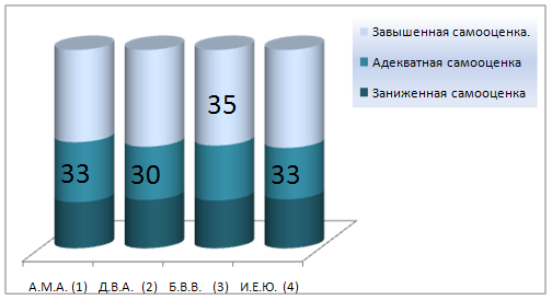 Для исследования особенности самооценки был проведен тест «Шкала самооценки».[5;69](Приложение 1) Тест «Шкала самооценки» проводился для измерения самооценки. Использование этих положений позволяет выявить общую оценку, которую дает себе индивид. Обработка данных: 1.Перекодирование баллов, которые помечены звездочкой ( * ): 0 = 4 1 = 3 3 = 1 4 = 0 2.Сумирование полученных баллов. Показатель общей самооценки может ранжироваться от 0 до 40: - Более высокий балл свидетельствует о более высоком уровне самооценки ( завышенной ). - Показатель выше 20 свидетельствует об общем позитивном отношении к себе ( адекватной ). - Показатель ниже 20 говорит об общем негативном отношении к себе ( заниженная ). При проведении данного теста получили следующие показатели уровня самооценки (Приложение 2):