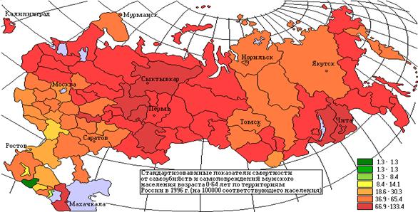 Из представленной таблицы видно, что пиковой показатель приходится на 1994 год, после чего происходит некоторый спад случаев суицида. Более наглядно динамику самоубийств можно проследить с помощью прилагаемых диаграмм: На 100 000 жителей Общее число