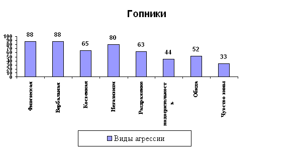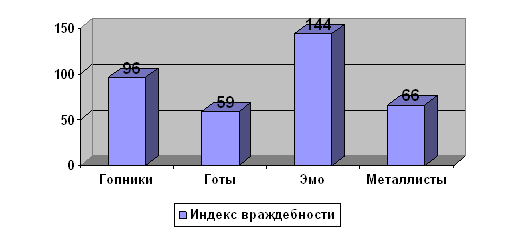 На этом графике отчетливо видно, что по уровню агрессивности на первом место стоят гопники. Это связано с тем, что гопники используют физическую силу против другого лица, выражают негативные чувства через речь, переходят от пассивного сопротивления до активной борьбы против установившихся законов и обычаев. Чувство вины для таких людей практически не присуще. Они постоянно вступают в конфликты из-за любой мелочи. Индекс враждебности: