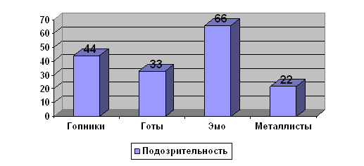 На этом графике на первом месте стоят эмо. Это можно объяснить тем, что эмо по любому поводу готовы проявить негативные чувства, вследствие своей эмоциональности. Подозрительность: