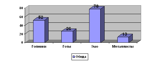 На этом графике эмо опять находятся на первом месте, и скорей всего это связано с тем, что эмо, как субкультуру не любят, и поэтому они относятся ко всем с подозрением и ожидают от любого человека подвоха. Обида: