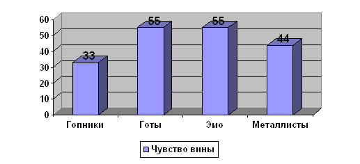 На этом графике эмо опять находятся на первом месте. Скорей всего, это можно объяснить тем, что в большинстве случаев эмо, как субкультуру, не любят. Из-за этого у них проявляется обида ко всем окружающим. Чувство вины:
