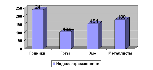 На этом графике готы и эмо находятся на первом месте. Это можно объяснить тем, что у готов проявляется чувство вины из-за того, что их субкультура подразумевает это, т.к. они постоянно находятся в состоянии депрессии, ходят на кладбища, иногда, так же как и сатанисты, они приносят жертвы (животных) и возможно, что им жаль, что они совершили такой поступок. У эмо это может быть связано с тем, что они очень эмоциональны, и очень близко все принимают к сердцу. Индекс агрессивности: