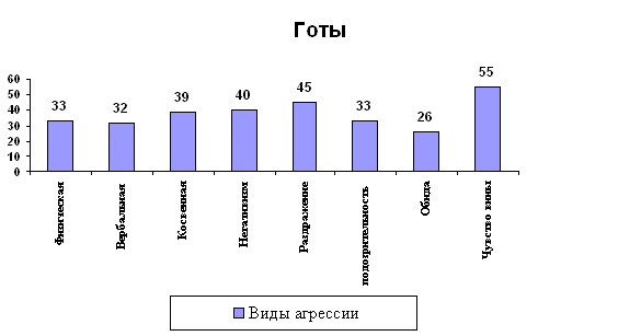 Из графика видно, что у гопников преобладает физическая агрессия, вербальная агрессия и негативизм. Это говорит о том, что уровень агрессии у гопников высокий, они используют физическую силу против другого лица, выражают негативные чувства через речь, переходят от пассивного сопротивления до активной борьбы против установившихся законов и обычаев. Чувство вины для таких людей практически не присуще. Готы: квазирелигиозная молодежная субкультура и связанное с ней молодежное движение, характеризующиеся мистически мрачным, депрессивным восприятием и выражением отношения к своей жизни. Идеология движения "готов" основана на идее романтизации смерти, боли, мучений, на исповедании эстетики смерти, тления. Однако, несмотря на эту характеристику, готы не агрессивны, они не обращают на других людей никакого внимания. Они живут в своем мире. Результаты: 1) Физическая агрессия – 3*11=33 2) Вербальная агрессия – 4*8=32 3) Косвенная агрессия – 3*13=39 4) Негативизм – 2*20=40 5) Раздражение – 5*9=45 6) Подозрительность – 3*11=33 7) Обида – 2*13=26 8) Чувство вины – 5*11=55 ИА=33+32+39=104 ИВ=33+26=59 Изобразим полученные результаты на графике: