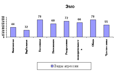 Из графика видно, что готы не обладают большой агрессией, все показатели почти на одном уровне. Это можно объяснить тем, что они живут в своем мире и им не важно, что происходит вокруг них, и, следовательно, им не на кого проявлять агрессию. Однако у готов очень высокое чувство вины, это можно объяснить тем, что их субкультура подразумевает это, т.к. они постоянно находятся в состоянии депрессии, ходят на кладбища, иногда, так же как и сатанисты, они приносят жертвы (животных) и возможно, что им жаль, что они совершили такой поступок. Эмо: стиль эмо предполагает наличие ярких эмоций, как позитивных, так и негативных. Для эмо выражение своих чувств - не проявление слабости. Эмо - это образ жизни и мышления человека. Результаты: 1) Физическая агрессия – 4*11=44 2) Вербальная агрессия – 4*8=32 3) Косвенная агрессия – 6*13=78 4) Негативизм – 3*20=60 5) Раздражение – 8*9=72 6) Подозрительность – 6*11=66 7) Обида – 6*13=78 8) Чувство вины – 5*11=55 ИА=44+32+78=154 ИВ=66+78=144 Изобразим полученные результаты на графике: