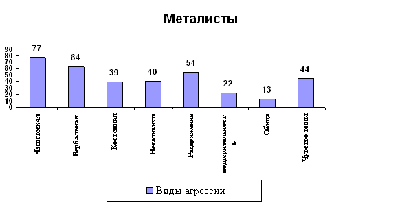 Из данного графика видно, что у эмо преобладает косвенная агрессия и обида. Скорей всего это связано с тем, что эмо немного трусливые и боятся вступить в конфликт с другими людьми, поэтому им нет смысла проявлять физическую или вербальную агрессию на кого-либо открыто. Однако, они проявляют косвенную агрессию на тех, кто не сможет причинить им вреда. Обида скорей всего преобладает из-за того, что в большинстве случаев эмо, как субкультуру, не любят. Металлисты: в отличие от субкультур готов и панков, субкультура металлистов лишена ярко выраженной идеологии и сосредоточена, в основном, вокруг музыки. Тем не менее, они пропагандируют независимость, самостоятельность и уверенность в себе, культ «сильной личности». Результаты: 1) Физическая агрессия – 7*11=77 2) Вербальная агрессия – 8*8=64 3) Косвенная агрессия – 3*13=39 4) Негативизм – 2*20=40 5) Раздражение – 6*9=54 6) Подозрительность – 2*11=22 7) Обида – 1*13=13 8) Чувство вины – 4*11=44 ИА=77+64+39=180 ИВ=22+44=66 Изобразим полученные результаты на графике: