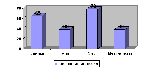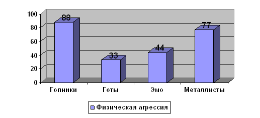 На этом графике мы можем видеть тоже самое, что и на предыдущем. Гопники на первом месте, металлисты на втором. Это можно объяснить все тем же, что и тех и у других возникают конфликты друг с другом. Косвенная агрессия: