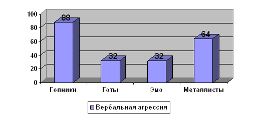 На этом графике мы можем видеть, что по критерию физической агрессии более агрессивными являются гопники. На втором месте находятся металлисты. Это можно объяснить тем, что гопники и металлисты являются «врагами», они находятся в постоянной вражде друг с другом, поэтому и у той и у другой субкультуры уровень физической агрессии находится на высоком уровне. Вербальная агрессия:
