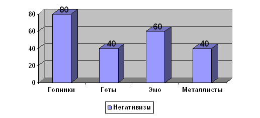 На этом графике мы видим, что по уровню косвенной агрессии на первом месте стоят эмо. Скорей всего это связано с тем, что эмо намного трусливее, нежели другие субкультуры, и боятся вступить в конфликт с другими людьми, поэтому им нет смысла проявлять физическую или вербальную агрессию на кого-либо открыто. У гопников же (стоят на втором месте) агрессия проявляется во всех видах, поэтому они и стоят на втором месте. Негативизм: