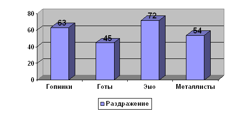 На этом графике гопники находятся на первом месте. Это можно объяснить тем, что в большинстве случаев, гопники ко всем относятся негативно и пытаются отстоят свою точку зрения с помощью активной борьбы. Раздражение: