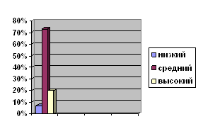 Анализ таблицы 1 показал, что уровень личностной тревожности среди испытуемых распределился следующим образом: - низкий – 1 человек (7%); - умеренный – 7 человек (73%); - высокий – 2 человека (20%).