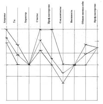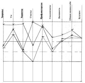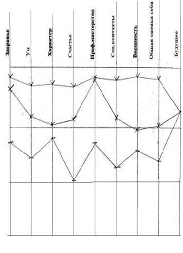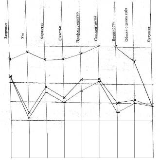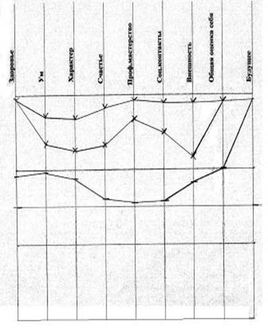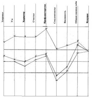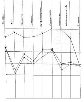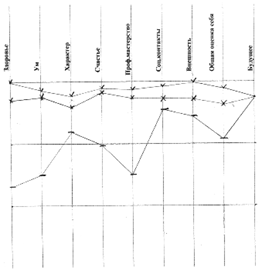 Рис. 8 - Самооценка: реальная – средняя, устойчивая; идеальная – высокая, устойчивая; достижимая – средневысокая, уровень личностной тревожности: высокий (54 б) У этой обследуемой три наиболее значимых расхождения между показателями реальной и идеальной самооценки по шкалам ум, профессиональное мастерство и внешность. Все эти параметры корреляции обсуждаются в нашей работе. Возможно, что это наиболее уязвимые места для обследуемой? Такое расхождение между показателями реальной и идеальной самооценки дает не тенденцию к высокой личностной тревожности, а высокую личностную тревожность, что напрямую доказывает нашу гипотезу. Устойчивая самооценка и отметки на шкале общая оценка себя говорят о том, что обследуемая несмотря на высокие предъявляемые требования к себе принимает себя и хорошо относится к себе. Испытуемый №7
