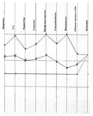 ПРИЛОЖЕНИЕ Б Исследование самооценки по методике Дембо-Руденштейн Данная методика основана на непосредственном оценивании (шкалировании) испытуемыми ряда личных качеств, таких как здоровье, способности, характер и т. д. Обследуемым предлагается на вертикальных линиях отметить определенными знаками уровень развития у них этих качеств (показатель самооценки) и уровень притязаний, т. е. уровень развития этих же качеств, который бы удовлетворял их. Каждому испытуемому предлагается бланк методики, содержащий инструкцию и задание. Проведение исследования Инструкция. «Любой человек оценивает свои способности, возможности, характер и др. Уровень развития каждого качества, стороны человеческой личности можно условно изобразить вертикальной линией, нижняя точка которой будет символизировать самое низкое развитие, а верхняя - наивысшее. Вам предлагаются девять таких линий. Они обозначают: здоровье; ум, способности; характер; счастье; проф. мастерство; соц. контакты; внешность; общая оценка себя и будущее. На каждой линии чертой (-) отметьте, как вы оцениваете развитие у себя этого качества, стороны вашей личности в данный момент времени. После этого крестиком (х) отметьте, при каком уровне развития этих качеств, сторон вы были бы удовлетворены собой или почувствовали гордость за себя». Испытуемому выдается бланк, на котором изображено девять линий, высота каждой - 100 мм, с указанием верхней, нижней точек и середины шкалы. При этом верхняя и нижняя точки отмечаются заметными чертами, середина - едва заметной точкой. Методика может проводиться как фронтально - с целой группой, так и индивидуально. При фронтальной работе необходимо проверить, как каждый испытуемый заполнил первую шкалу. Надо убедиться, правильно ли применяются предложенные значки, ответить на вопросы. После этого испытуемый работает самостоятельно. Время, отводимое на заполнение шкалы вместе с чтением инструкции, 10-12 мин. Обработка и интерпретация результатов Обработка проводится по шести шкалам (первая, тренировочная - «здоровье» - не учитывается). Каждый ответ выражается в баллах. Как уже отмечалось ранее, длина каждой шкалы 100 мм, в соответствии с этим ответы испытуемых получают количественную характеристику (например, 54мм = 54 баллам). По каждой из шести шкал определить: уровень притязаний - расстояние в мм от нижней точки шкалы («v») до знака «х»; высоту самооценки - от «v» до знака «-»; значение расхождения между уровнем притязаний и самооценкой - расстояние от знака «х» до знака «-», если уровень притязаний ниже самооценки, он выражается отрицательным числом. Рассчитать среднюю величину каждого показателя уровня притязаний и самооценки по всем шести шкалам. Уровень притязаний Норму, реалистический уровень притязаний, характеризует результат от 60 до 89 баллов. Оптимальный - сравнительно высокий уровень - от 75 до 89 баллов, подтверждающий оптимальное представление о своих возможностях, что является важным фактором личностного развития. Результат от 90 до 100 баллов обычно удостоверяет нереалистическое, некритическое отношение детей к собственным возможностям. Результат менее 60 баллов свидетельствует о заниженном уровне притязаний, он - индикатор неблагоприятного развития личности. Высота самооценки Количество баллов от 45 до 74 («средняя» и «высокая» самооценка) удост