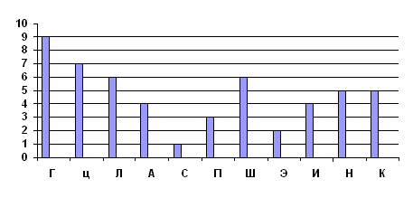 В итоге, проанализировав все таблицы, мы получили следующее: гипертимный тип – 9 баллов, циклоидный тип – 7, лабильный тип – 6, астеноневротический тип – 4, сенситивный тип – 1, психастенический тип – 3, шизоидный тип – 6, эпилептоидный тип – 2, истероидный тип – 4, неустойчивый – 5, конформный тип – 5. На основе этих данных строится график: