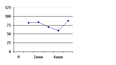 Показатель S находится в интервале от 0.60 – 1.00, а это свидетельствует о средней продуктивности внимания и составляет 5–6 баллов. По полученным результатам, с учетом всех особенностей выполненной работы, строится график работы над заданием по следующим точкам: (1; 0.82), (2; 0.84), (3; 0.70), (4; 0.60), (5; 0.88), где первая цифра указывает на время, а вторая – на показатель продуктивности и устойчивости внимания, продемонстрированного за это время.