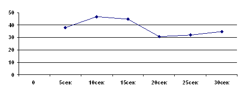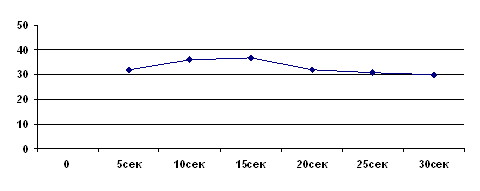 По результатам левой руки, подсчитанным таким же образом, как и правой, мы получили следующие точки: (5; 32), (10; 36), (15; 37), (20; 32), (25; 30), (30; 30). По этим точкам строим график для левой руки: