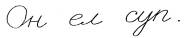 №3. Методика "Имитация написанного текста" (вариант задания из теста "Школьной зрелости" А. Керна и И. Ирасека) Выполнение заданий этой методики требует от ребенка проявить волевое усилие при исполнении не очень интересной работы, выполнять задание в форме подражания образцу. Способности ребенка к такого рода действиям важны для овладения учебной деятельностью. Важно также в процессе выполнения такого рода заданий выявление особенностей тонкой моторики кисти руки, двигательной координации. Благодаря этому можно не только прогнозировать успешность овладения навыками письма и рисунка, но и сделать заключение (ориентировочное) о развитии у ребенка способности к саморегуляции и управлению своим поведением в целом. Известно, что уровень развития тонкой моторики, мелких движений является одним из важных показателей психического развития. Диагностическая процедура заключается в предъявлении ребенку заранее написанной на белом листе бумаги фразы: "Он ел суп". Фраза должна быть написана обычным почерком, крупно и ясно. Ребенку предлагается следующая инструкция: "Посмотри: здесь на листе что-то написано. Ты еще пока не умеешь писать. Но попробуй - не смог (смогла) бы ты это написать? Посмотри внимательно и постарайся рядом написать точно также". Для каждого ребенка может быть приготовлен отдельный лист с образцом надписи, можно воспользоваться одним образцом для всех детей, давая каждому ребенку для работы чистый лист бумаги. Желательно, чтобы скопированная ребенком фраза уместилась на одной строке. Если же так не получается, ребенок может последнее слово написать выше или ниже предыдущих.