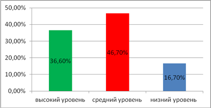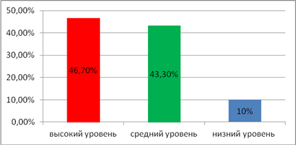 Интерпретация результатов Высокий уровень - 10-9 баллов - говорит о школьно-учебной ориентации ребенка и положительном отношении к школе (внутренняя позиция школьника достаточно сформирована); Средний уровень - 8-5 баллов - свидетельствуют о преимущественном интересе ребенка к внешней атрибутике школьной жизни (начальная стадия формирования внутренней позиции школьника); Низкий уровень - 4-0 баллов - ребенок не проявляет интереса к школе (внутренняя позиция школьника не сформирована). Вывод. При проведении методики "Беседа о школе" о школьно-учебной ориентации ребенка и положительном отношении к школе получила такие результаты: высокий уровень - 26,7%; средний - 53,3%; низкий - 20%.