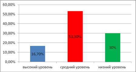 Обработка результатов Оценка успешности выполнения заданий производится следующим образом. 1 балл - выполнение задания с первого предъявления; 0,5 балла - задание выполнено со второй попытки, после того, как психологом была оказана помощь. Интерпретировать количественные результаты можно с учетом данных Л. Переслени, Е. Мастюковой, Л. Чупрова. Высокий уровень - 7 и более баллов: у детей сформирована такая мыслительная операция, как умозаключение. Средний уровень - 5 - 7 баллов: выполнение мыслительной операции осуществляется детьми в "зоне ближайшего развития". В процессе обучения, в первоначальный период, полезно давать таким детям индивидуальные задания по развитию мыслительных операций, оказывая минимальную помощь. Низкий уровень - менее 5 баллов: у детей практически отсутствуют навыки мыслительных операций, что предъявляет особые требования к развитию у них навыков логического мышления в учебной познавательной деятельности. Вывод. По результатам методики "Умозаключение" на выполнение мыслительной операции получила следующие результаты: высокий уровень - 16,7%; средний - 53,3%; низкий - 30%.