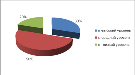 Для определения уровня готовности к школе детей дошкольного возраста я использовала методику (№1)"Беседа о школе" (Т.А. Нежнова), тест (№2) на определение уровня развития произвольной регуляции деятельности, методику (№3)"Имитация написанного текста" (А. Керн и И. Ирасек) и методику (№4)"Умозаключения" (Э. Замбацявичене, Л. Чупров и др.). Мои исследования показали (рис.1), что детей с высоким уровнем - 30% (внутренняя позиция школьника достаточно сформирована), средним уровнем - 50% (начальная стадия формирования школьника), низким - 20% (внутренняя позиция школьника).