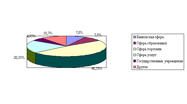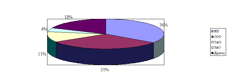 Рисунок 1 - Сферы деятельности предприятий Проанализировав таблицу Приложения Б можно сказать, что среди указанных форм собственности наибольшую долю имеют ИП – 35 % от общего числа опрошенных. Наименьшую долю имеют ЗАО, что составляет 4 %. Графическое представление данных таблицы изображено на рисунке 2.