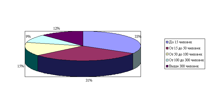 Рисунок 2 - Формы собственности предприятий Анализ численности работников предприятий приведённый в таблице Приложения В показал, что предприятия имеющие до 15 работников занимают первое место по количеству ответов, что составляет 33 %. Наименьшее число ответов относится к предприятиям с численностью от 100 до 300 человек - 9 %. Графическое представление данных таблицы изображено на рисунке 3.