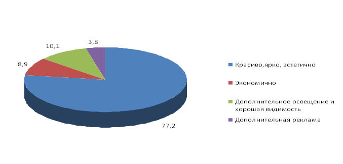 Наибольшая часть опрошенных респондентов в количестве 104 человек осведомлены о светодиодной подсветке зданий и сооружений, что составило 88,14 процентов от общего числа опрошенных, 14 респондентов (11,86%) не знают что такое архитектурная светодиодная подсветка зданий и сооружений. В таблице приложения Д собраны преимущества архитектурной светодиодной подсветки, отмеченные респондентами. 61 респондент считает архитектурную светодиодную подсветку зданий и сооружений красивой, яркой и эстетичной, что составило 77,2 %, а всего 3,8 % лишь дополнительной рекламой. Графическое изображение данных таблицы представлено на рисунке 5.