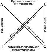 2.Установите вид сложного суждения, укажите его составные части (простые суждения), запишите суждения с помощью символов, используя логические связки. Если сложное суждение комбинированное - приведите его полную логическую схему. 2.1. "Если черт снимет с себя шкуру, он вместе с тем потеряет и свое лицо" (Ф. Ницше); 2.2. "Лицо, задержавшее безнадзорных животных, и лицо, которому они переданы на содержание и в пользование, обязаны их надлежаще содержать и при наличии вины, отвечают за гибель и порчу животных в пределах их стоимости" (Гражданский кодекс РФ). 2.1. Если (черт снимет с себя шкуру),то (он вместе с тем потеряет и свое лицо) Импликативное суждение, логическая форма a ® b 2.2. Если [( Лицо, задержавшее безнадзорных животных), и (лицо, которому они переданы на содержание и в пользование)], при наличии вины, отвечают за гибель и порчу животных в пределах их стоимости. Сложное комбинированное суждение, логическая схема данного высказывания (S1ÙS2) ® P, запись в логической форме (aÙb) ® c. Присутствует конъюнкция и импликация. 3. Используя логический квадрат, выведите суждения противоположные, противоречащие, подчиненные и определите частичную совместимость. Установите их истинность или ложность. 3.1. Все свидетели обязаны давать правдивые показания; 3.2. Ущерб, причиненный при перевозке груза или багажа, возмещается перевозчиком.