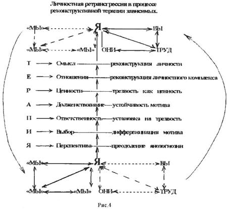 Как видно из таблицы данные исследования позволяют не только диагностировать квазиличность объективно, но и наполнить психотерапевтический процесс конкретным и направленным содержанием. III Такие представления о психогенезе образования зависимой личности, формирования квазиличностного комплекса позволили нам вплотную подойти к пониманию методологии лечебно-восстановительного процесса и адекватно построить психотерапевтическую работу по реконструкции личностного комплекса. Проанализировав опыт отечественной и зарубежной наркологии, учитывая собственные успехи и неудачи, мы пришли к выводу, что помимо мотивационных, интернальных и ценностных ориентаций (Т.Н.Дудко, 1999г.), необходимо восстанавливать систему отношений, определяющую экзистенцию человека. Все это позволило нам построить методологический ряд реконструктивной терапии, обеспечивающий личностную ретрансгрессию. (рис.4)