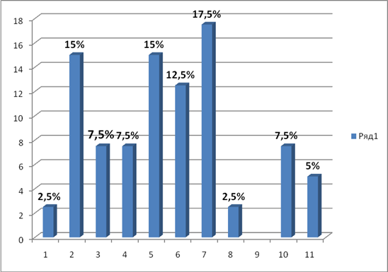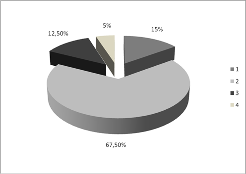 Рис. 1. Процент испытуемых с разной степенью выраженности ПА (1) 15% - значения ниже среднего. (2) 67,5% - средние значения. (3) 12,5% - значения выше среднего. (4) 5% - высокие значения. Также были проанализированы ответы испытуемых. Оказалось, что на вопрос «Как долго вы употребляете пиво» 2,5% испытуемых ответили 1 год, 15% - 2 года, 7,5% - 3 года, 7,5% - 4 года, 15% - 5 лет, 12,5% - 6 лет,17,5% - 7 лет,2,5% - 8 лет, 7,5% - 10 лет, 5% - 11 лет и 7,5% испытуемых не смогли вспомнить длительность употребления ими пива. По этим данным приблизительно получается, что в среднем стаж употребления пива у современной молодежи не менее 5 лет и начали они это делать с 15 лет. На данной столбчатой диаграмме представлен процент испытуемых с разной длительностью употребления пива.