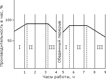 1 – период врабатывания, или вхождения в работу, (0,5 - 1,5 часа), имеет низкие показатели работоспособности. 2 – период устойчивого сохранение работоспособности (2 - 2,5 часа). 3 – период снижения работоспособности в результате утомления. Для снижения утомления в процессе труда и повышения работоспособности используют следующие эффективные методы: - рациональная организация рабочего места и времени; - рациональный режим труда и отдыха; -производственная гимнастика; комнаты психофизиологической разгрузки. Для поддержания высокого уровня работоспособности при умственном труде необходимо соблюдать ряд условий. Постепенное вхождение в работу после сна или летнего отдыха обеспечивает последовательное включение физиологических механизмов, определяющих высокий уровень работоспособности. Необходимо соблюдать определенный ритм работы, что способствует выработке навыков и замедляет развитие утомления. Соблюдение привычной последовательности и систематичности в работе обеспечивает более длительное сохранение рабочего динамического стереотипа. Правильное чередование умственного труда и отдыха, чередование умственного труда с физическим предупреждает развитие утомления, повышает работоспособность. Высокая работоспособность сохраняется и при систематических упражнениях в умственном труде. Хорошим отдыхом не только для глаз, но и для головного мозга, является закрытие глаз на несколько минут, глубокое ритмичное дыхание, умеренная мышечная нагрузка в паузах, длительный, спокойный сон. Факторы тяжести и напряжённости трудового процесса В соответствии с Р.2.2 755-99, различают три класса условий труда по показателям тяжести и напряженности труда. 1. Оптимальный (легкий) труд. Затраты энергии - до 174 Вт. 2. Допустимый труд (средней тяжести). Затраты энергии - от 175 до 290 Вт. 3. Вредный (тяжелый) труд. Затраты энергии - свыше 290 Вт. Физическая тяжесть труда - это нагрузка на организм при труде, требующая преимущественно мышечных усилий и соответствующего энергетического обеспечения. С учетом вида нагрузки и нагружаемых мышц физическая работа делится на статическую и динамическую. Статическая работа связанна с фиксацией орудий и предметов труда в неподвижном состоянии, с поддержанием тела или его частей в пространстве (фиксация рабочей позы). Внешняя мышечная работа отсутствует, но остаётся напряжённое состояние мышц, длящееся бесконечно долго. Это приводит к сильному утомлению мышц, а с учётом недостаточного их кровоснабжения, к заболеванию мышечной и периферийной нервной системы. Пример статической работы - часовой на посту. Динамическая работа - процесс сокращения мышц, приводящий к перемещению груза, а так же самого тела человека или его частей, в пространстве. При этом энергия организма расходуется как на поддержание определённого напряжения в мышцах, так и на механический эффект работы. Динамическая работа подразделяется на общую мышечную работу, выполняемую более чем 2/3 мышц скелетной мускулатуры, в том числе ног и туловища (грузчики, сельхозрабочие); региональную мышечную работу, которая выполняется мускулатурой плечевого пояса и верхних конечностей; локальную мышечную работу с участием менее чем 1/3 скелетных мышц. Напряженность труда характеризуется эмоциональной нагрузкой на организм при труде, требующем преимуществен