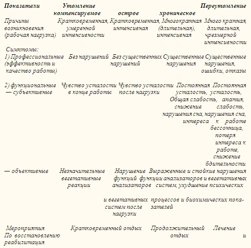 Рис. 25-1. Изменение функциональных показателей человека в процессе развития утомления По видам утомление может быть физическим, умственным, эмоциональным и смешанным; общим и локальным; мышечным, зрительным, слуховым, интеллектуальным (творческим). По формам это состояние классифицируется на компенсируемое, острое, хроническое утомление и переутомление. Современная классификация утомления (табл. 25.1) построена на основе учета трех групп показателей: 1) причины его возникновения; 2) симптомы проявления; 3) способы и продолжительность восстановления работоспособности. Таблица 25.1 Классификация утомления