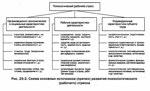 Психологический стресс Термин "стресс" (от англ. stress — давление, напряжение) заимствован из техники. В физиологии, психологии, медицине этот термин применяется для обозначения обширного круга состояний человека, возникающих в ответ на разнообразные экстремальные воздействия. Для обозначения неспецифической реакции организма (общего адаптационного синдрома) в ответ на любое неблагоприятное воздействие понятие "стресс" первоначально использовалось в физиологии. В последующем возникло много толкований этого понятия, что позволило Г. Селье отметить, что "стресс, подобно теории относительности, является научной концепцией, которая страдает от смешения в сознании представлений, отражающих хорошее знание проблемы и недостаточное ее понимание". Психологический стресс — это состояние чрезмерной психической напряженности и дезорганизации поведения, которое развивается в результате угрозы или реального воздействия экстремальных факторов социального, психологического, экологического и профессионального характера (рис. 25-2). Анализ психологического стресса требует учета как значимости ситуации для субъекта, так и его личностных характеристик. Стресс в значительной степени является продуктом образа мысли и оценки ситуации, знания собственных возможностей, степени обученности способам управления и стратегии поведения в экстремальных условиях. Психологический стресс представляет собой прежде всего состояние тревоги за жизнь, здоровье, успех, благополучие. Психологический стресс — состояние чрезмерной психической напряженности и дезорганизации поведения. В качестве стрессовой может быть признана только такая реакция индивида, которая достигает пороговых уровней его психологических и физиологических возможностей. Изменение поведения при стрессе является специфическим и более интегральным показателем характера ответа на воздействие, чем отдельные функциональные показатели. В состоянии стресса у человека часто доминирует форма поведения с повышением возбудимости, выражающаяся в дезорганизации поведения, утрате ряда ранее приобретенных реакций, преобладании стереотипных ответов, появлении ошибочных действий. Л. А. Китаев-Смык выделил две наиболее общие формы изменений поведенческой активности при кратковременных, но достаточно интенсивных стрессовых воздействиях: активно-эмоциональная, направленная на удаление экстремального фактора (агрессия, бегство), и пассивно-эмоциональная, проявляющаяся в ожидании окончания воздействия экстремального фактора (уменьшение активности, снижение эффективности защитных действий). Когнитивная теория стресса. Наиболее полно процессы зарождения, развития и проявления психологического стресса представлены в когнитивной теории стресса, основу которой составляют положения о роли субъективной познавательной оценки угрозы неблагоприятного воздействия и своей возможности преодоления стресса (Лазарус Р., 1970). Угроза рассматривается как состояние ожидания субъектом вредного, нежелательного влияния внешних условий и стимулов. "Вредоносные" свойства стимула (условий) оцениваются по характеристикам интенсивности воздействия, степени неопределенности значения стимула и времени воздействия, а также ресурсов индивида по преодолению такого воздействия.