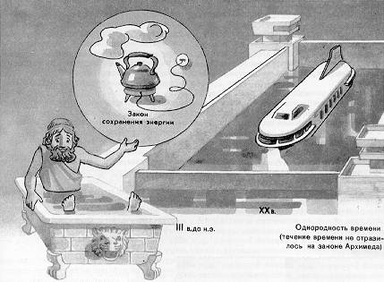 Таким образом, все симметрии, которые мы до сих пор рассматривали, объединяются в одну, всеобщую — все явления . природы инвариантны относительно сдвигов» поворотов и отражений в четырехмерном пространстве-времени. Инвариантность относительно сдвигов и поворотов в обычном пространстве получается как частный случай, когда сдвиг не изменяет отсчета времени или когда вращение происходит вокруг временной оси. Нужно пояснить, что означает инвариантность явлений природы относительно поворотов. Все физические величины можно классифицировать по тому, как они изменяются при повороте. Есть величины, определяемые только их числовым значением, без указания направления (например, объем, масса, плотность и др.), — они называются скалярами. Другие величины — векторы — определяются и направлением из начала координат в какую-либо точку пространства. При повороте системы координат квадрат вектора не изменяется, а его проекции на оси координат изменяются по установленному физикой закону. Есть величины, изменяющиеся более сложно, например как произведение двух векторов. Они называются тензорными. Кроме векторных и тензорных величин существуют другие, которые изменяются заданным образом при поворотах. Их называют спинорами. Из спиноров можно образовать квадратичную комбинацию, изменяющуюся, как вектор, или скалярную, не изменяющуюся при поворотах. Неизменность законов или уравнений при поворотах означает, что во всех слагаемых уравнения и в левой и в правой части стоят величины, одинаково изменяющиеся при поворотах. Так же как бессмысленно сравнивать величины разной размерности, скажем время и длину, массу и скорость, невозможно и равенство, в котором слева — скаляр, а справа — вектор. Суть симметрии именно в разделении величин на векторы, скаляры, тензоры, спиноры... Все рассмотренные симметрии называются пространственными. Кроме них, в физике элементарных частиц играют важную, роль внутренние симметрии, означающие неизменность явлений при внутренних изменениях полей или частиц. Примером может служить изотопическая инвариантность сильных взаимодействий, которая проявляется в независимости свойств некоторых частиц от их «зарядового» состояния. Так свойства нейтрона и протона по отношению к сильным взаимодействиям с большой точностью совпадают. Важнейшее следствие симметрии состоит в том, что каждой симметрии, как внутренней, так и пространственной, соответствует свой закон сохранения. В частности, закон сохранения энергии есть строгое следствие однородности времени, а закон сохранения импульса (количества движения) следует из однородности пространства. Это же относится и ко всем остальным симметриям. СПОНТАННОЕ НАРУШЕНИЕ СИММЕТРИИБольшинство симметрии возникает при некоторой идеализации задачи. Учет влияния более сложных взаимодействий приводит к нарушению симметрии. Например, независимость энергии атома водорода от орбитального момента делается неточной, и симметрия слегка нарушается, если учесть релятивистские поправки к движению электрона. Даже законы сохранения, связанные с пространственной симметрией, очень слабо, но все же нарушаются неоднородностью Вселенной во времени и пространстве. Существует гораздо более важное нарушение симметрии — спонтанное (самопроизвольное). Оно заключается в том, что в сис