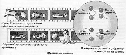 Законы природы не изменяются и от замены направления течения времени на обратное. Это означает, что взгляд назад являет такую же картину, как и взгляд вперед. Так ли это? Нам случалось видеть, как яйцо, упавшее со стола, растекается, но никогда не доводилось наблюдать, как белок и желток собираются обратно в скорлупу и «прыгают» на стол. И тем не менее молекулы в принципе могут случайно так согласовать свои движения, что невероятное свершится. В малом масштабе явления такого рода происходят с большой вероятностью: молекулы в малом объеме газа под влиянием столкновений то стекаются вместе, то растекаются так, что их плотность только в среднем является постоянной. Глубокий анализ подобных фактов привел физиков к заключению, что «обратимость» времени существует не только в механике и электродинамике, где она прямо вытекает из уравнений, но и во многих других явлениях природы.
