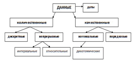 Рис.2—Типы данных [7]. STATISTICA позволяет работать со всеми типами данных. В большинстве модулей анализа ППО ограничивает тип вводимых данных в соответствии с применимостью того или иного метода. Так, при работе в модуле логистической регрессии могут быть использованы только бинарные данные (кодируются 0 и 1). Статистическую обработку данных удобно разбить на следующие четыре этапа. 1. Начальная обработка, т.е. представление исходных данных в подходящей для анализа форме, и проведение проверки качества данных. 2. Предварительный анализ данных, направленный на выяснение общей формы данных и предложение путей более обстоятельного анализа. Часто такой предварительный анализ успешно проводится простыми графическими методами или путем табличного представления данных. 3. Итоговый анализ (статистическая обработка), цель которого – дать основу для выводов. 4. Представление выводов в краткой и ясной форме. Обычно это приводит к необходимости интерпретации выводов на языке рассматриваемой области исследования [6]. Любой статистический анализ начинается с определения основных параметров описательной статистики, таких как мода, медиана, значения перцентилей и т. д. вычисление параметров описательной статистики осуществляется в модуле Basic Statistics/Tables (Основные статистики и таблицы). В модуле Basic Statistics/Tables в разделе Summary.Descriptive на вкладке Advaced позволяет вычислить следующие параметры описательной статистики: · Valid N — общее число вариантов в выборке; · Mean — среднее арифметическое; · Sum - сумма всех значений вари; Median — медиана; · Standard Deviation - среднее квадратическое отклонение выборки; · Variance — дисперсия выборки; · Standard error of mean — ошибка среднего арифметического; · 95% confidence limits of mean — 95% доверительный интервал для среднего; · Minimum & maximum — минимум и максимум; · Lower & upper quartiles — границы 1 и 3 квартилей; · Range — размах выборки (определяется как разность между максимальным и минимальным значениями вариантов); · Quartile range — диапазон квартилей; · Skewness — коэффициент асимметрии · Kurtosis — коэффициент эксцесса · Standard error of skewness — стандартная ошибка асимметрии · Standard error of kurtosis — стандартная ошибка эксцесса [7]. Выбор метода анализа в соответствии с типом распределения данныхСуществует множество методов статистического анализа данных. В каждом конкретном случае можно выбрать несколько возможных вариантов анализа. Однако при несоблюдении критериев использования того или иного метода полученный результат может оказаться неточным. Наиболее характерными являются ошибки: · использование параметрических методов (основанных на предположении о нормальном распределении данных) для анализа данных, не подчиняющихся нормальному распределению (1); · использование методов, предназначенных для независимых выборок, при анализе парных данных (2) [10, 11]. STATISTICA позволяет проверить описываются ли распределение признаков нормальным законом распределения (з. Гаусса). В тех случаях, если данные распределяются по какому-либо иному закону, нельзя проводить сравнение по достаточно популярным критериям Стьюдента или подсчет корреляции по методу Пирсона. Если данные являются дискретными, их сопоставление проводится по критериям c2, а непрерывные данные сопоставляются по критерию Колмогорова — Смирнова. Рассчитать критерии Колмогорова — Смирнова для нормального расправления можн