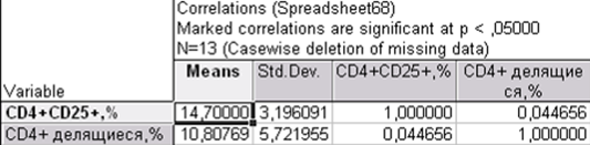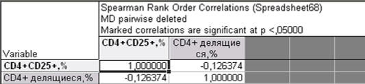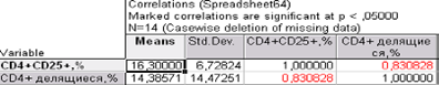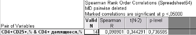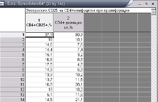 Рис.6—Инструмент «Тест различий» в модуле основной статистики Практическая часть В эксперименте была изучена экспрессия CD25 (рецептор к интерлейкину 2) на CD4+ лимфоцитах больных рассеянным склерозом при пролиферативном ответе на МОГ (антиген миелина). Данные получены с помощью проточного цитофлуориметра. Принята нулевая гипотеза: Процентное содержание пролиферирующих (делящихся) клеток не связано с процентным содержанием CD25-позитивных CD4+ лимфоцитов. Статистическая обработка данных эксперимента проведена непараметрическими методами в ППО STATISTICA 8.0. В примере приведена вторичная обработка данных с целью показать необходимость последовательного анализа, включая проверку распределения на соответствие закону нормального распределения.