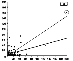 Рис.3 – Влияние выпадающего значения на линейное уравнение регрессии [9]. На рисунке проиллюстрирован случай, когда высокое значение коэффициента по Пирсону обусловленным единственной «выпадающей» точкой (выделена кружком). Показана линейная регрессия с учетом этого образца (тонкая верхняяя линия) и без него (толстая нижняя линия) [9]. Более рационально использование ранговых методов— вычисления коэффициента корреляции Кендалла (для порядковых переменных/шкал) или коэффициента корреляции Спирмена — непараметрического аналога коэффициента Пирсона для интервальных и порядковых переменных, не подчиняющихся нормальному распределению. Коэффициент Пирсона равен 1 (или минус 1) тогда и только тогда, когда две переменные (х и у) связаны линейной зависимостью (у=в+ах). Коэффициент Спирмена (или Кендалла) равен 1, если две переменные связаны правилом: большему значению переменной х всегда соответствует большее значение переменной у. Чем ниже коэффициент корреляции, тем сильнее отклонение от этих правил [9]. Следует помнить, что наличие корреляции двух переменных не означает их причинно-следственной связи [8]. Существуют следующие способы сравнения двух групп по количественным признакам: вычисление доверительного интервала для разности средних или проверка гипотез (параметрическими или непараметрическими методами). В случае соответствия нормальному закону распределения переменных в каждой группе сравнение групп проводится по критериям Стьюдента (статистический модуль Basic Statistics/Tables). В противном случае - использовать непараметрические критерии, которые находятся в модуле Nonparametrics [5]. При сравнении более двух групп по количественным признакам используют однофакторный дисперсионный анализ (параметрический или непараметрический) в случае независимых групп и непараметрический метод Фридмена в случае зависимых групп. Для сравнения групп по качественным признакам используют только непараметрические критерии. Проблема ошибочного использования методов сравнения, предназначенных для несвязанных (независимых групп), к зависимым группам отчасти решается структурой таблиц данных (размещение результатов последовательных измерений (принадлежащих к зависимым группам) в строках, а независимых—в столбец в соответствии со столбцом, содержащим код группы (Indep. (grouping) variable)). Более того, в программе пиктограммы, сопровождающие названия методов анализа носят характер подсказки: показано взаимное расположение сравниваемых массивов данных (рис.4).